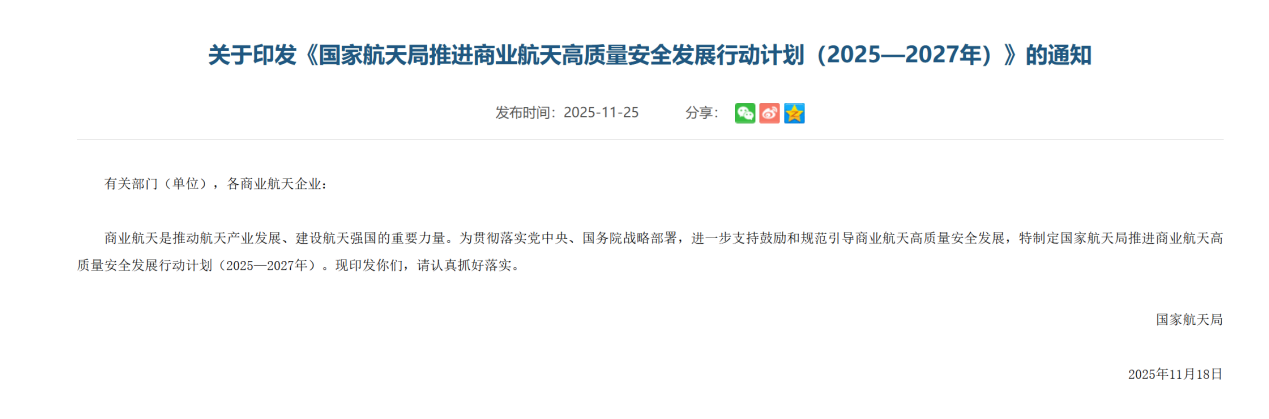 近日,国家航天局正式印发《推进商业航天高质量安全发展行动计划(2025—2027年)》(以下简称《计划》),为商业航天的未来三年发展绘就了清晰蓝图。这份重磅文件的发布,标志着商业航天作为“推动航天产业发展、建设航天强国的重...